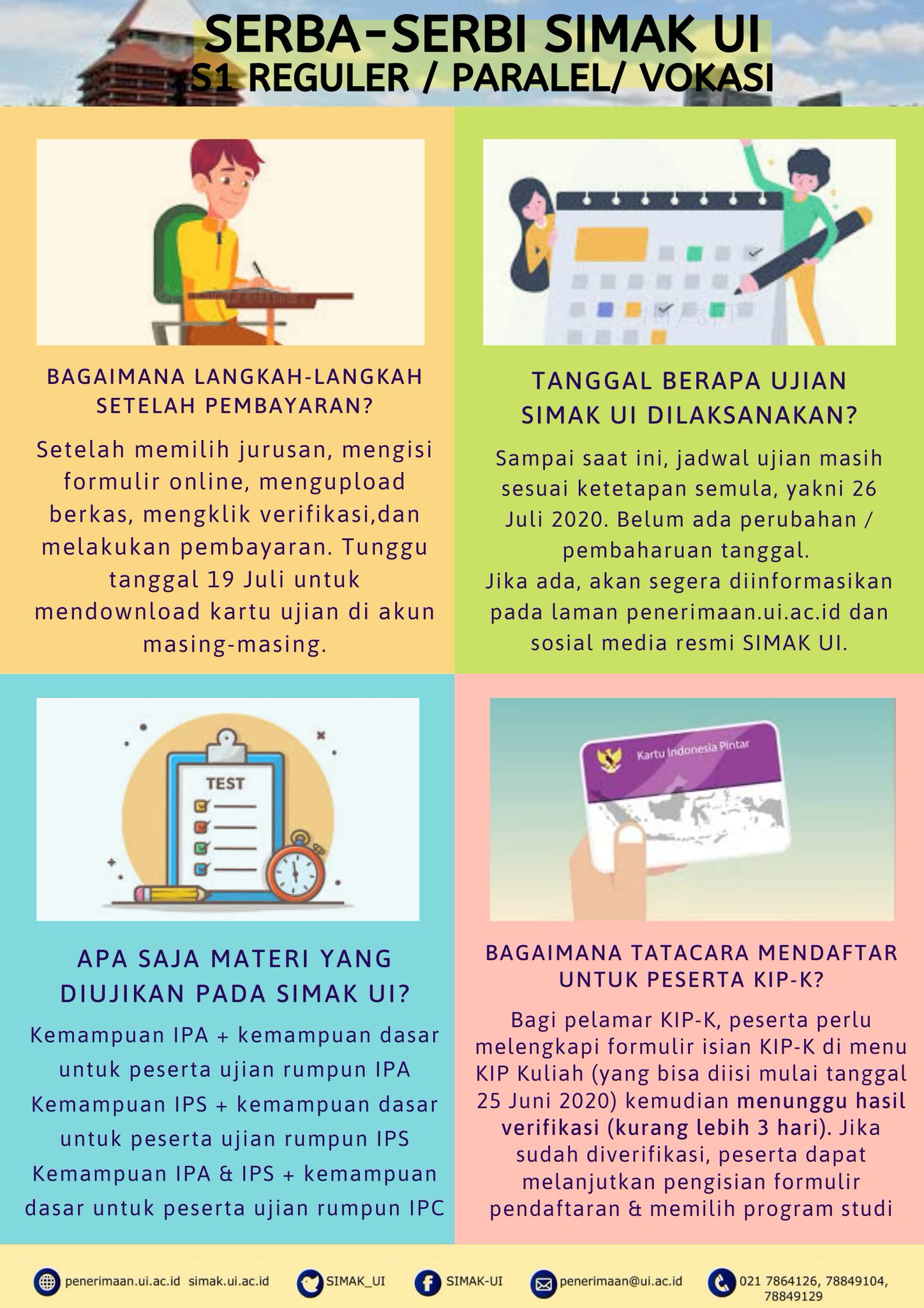 Petunjuk lebih rinci seputar pengerjaan soal bisa kamu cek di lembar soal sebelum ujian berlangsung. Ujian ini dilakukan secara serentak di seluruh indonesia untuk seluruh program pendidikan yang ada di ui, mulai program vokasi (d3), sarjana reguler. Ujian simak untuk program pendidikan vokasi, s1 reguler, dan s1 paralel tahun 2021 akan dilaksanakan pada 19 dan 20 juni 2021. Pendaftaran simak ui sudah dibuka mulai 03 mei 2021 dan ditutup pada tanggal 09 juni 2021. Untuk mengikuti ujian seleksi masuk kelas internasional di ui ini, para calon peserta hanya bisa menggunakan jalur mengikuti ujian simak pada waktu dan lokasi yang telah ditentukan dan tertera pada kartu ujian.
